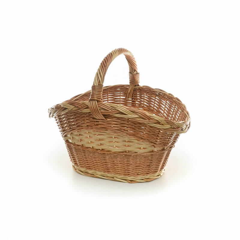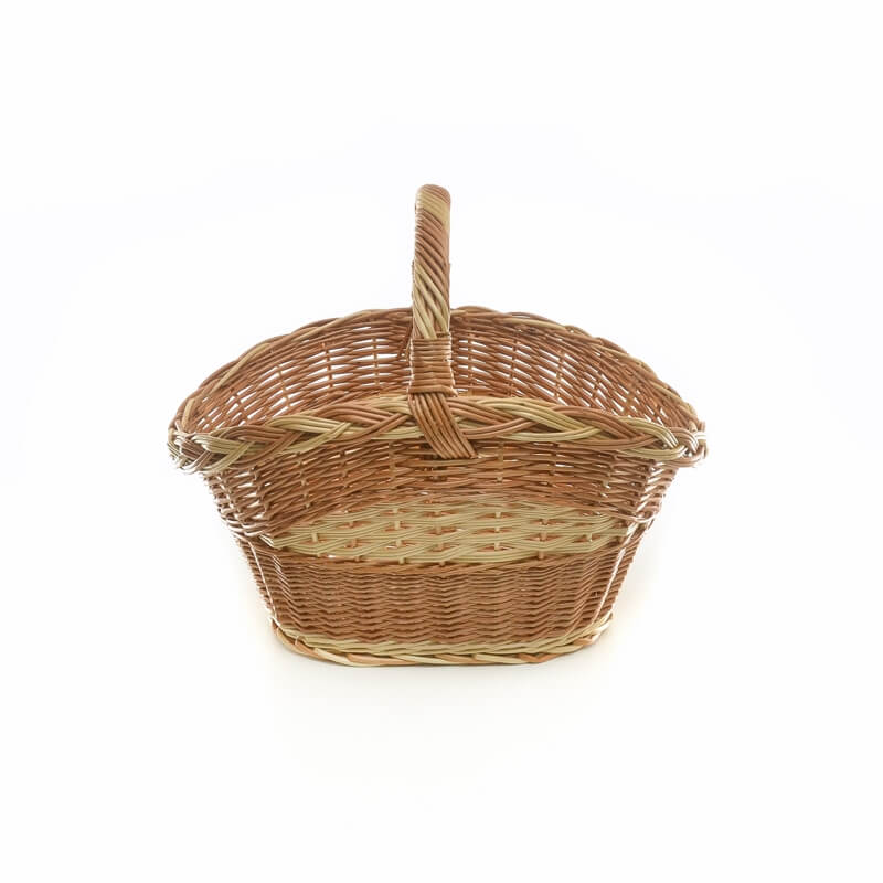 Dno košare je ovalno in ožje pleteno, pri čemer se proti vrhu elegantno razširi in konča s čudovito kito, spretno spleteno iz prepletanja bele in rjave šibe.